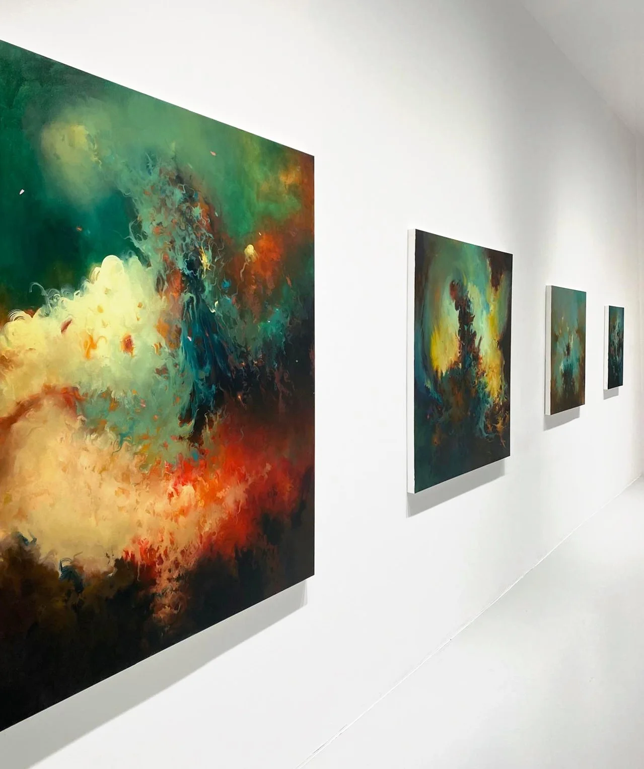 One of the gallery spaces in the Arts Center is dedicated to Iraqi artist Bassim Al Shaker’s heartbreakingly beautiful canvases, “Sky Revolution” (2023) and new pieces “Allegory of the Sky” and “New Birth.” The former renders scenes witnessed by Al Shaker following bombings during the Iraq War in 2003, meant to evoke the simultaneous cataclysmic rupture and frozen silence of the sky during aerial bombardment.